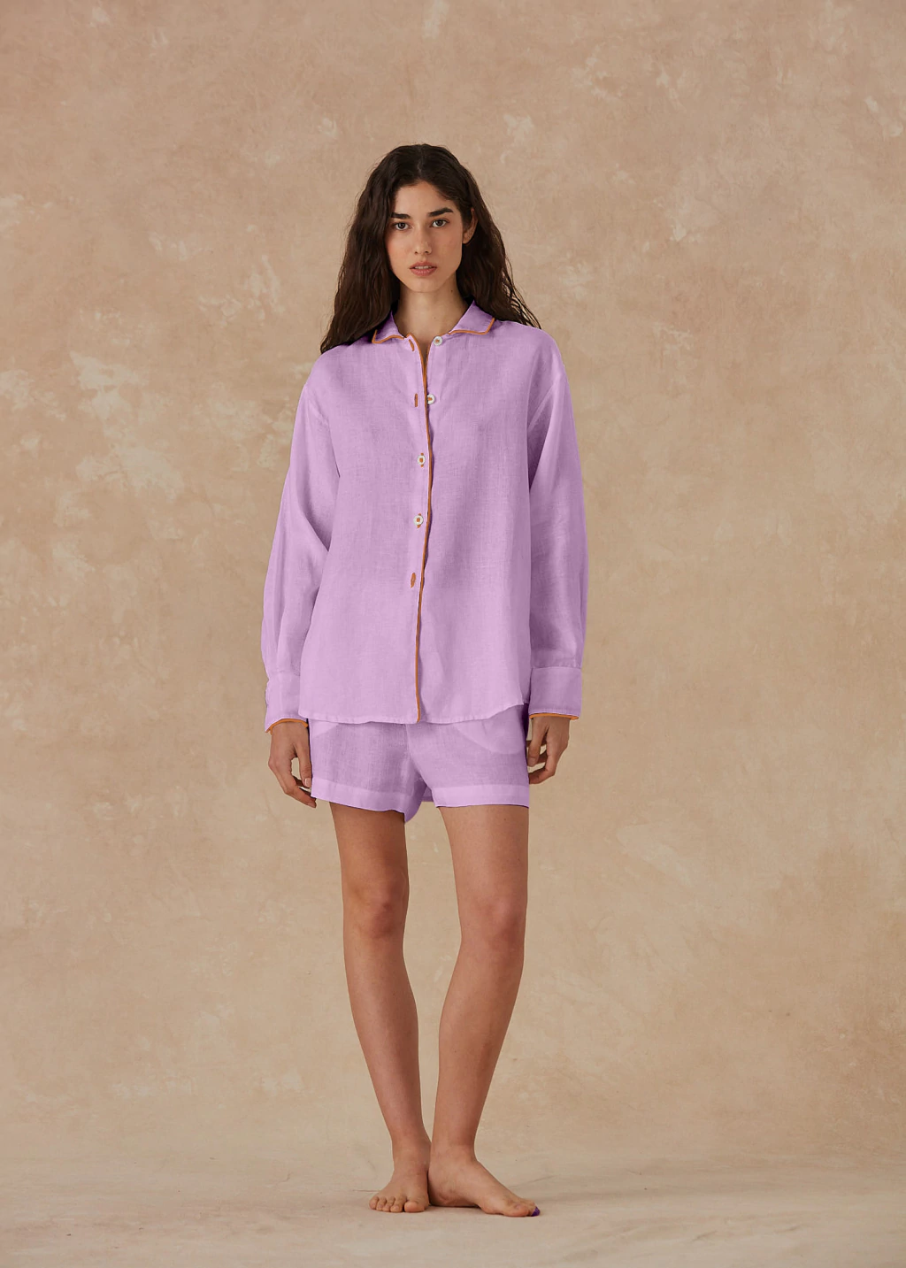 Set confeccionado en 100% lino. La camisa es manga larga con abotonadura central y botones de nácar. El cuello, la cartera y los puños están envivados en lino naranja.